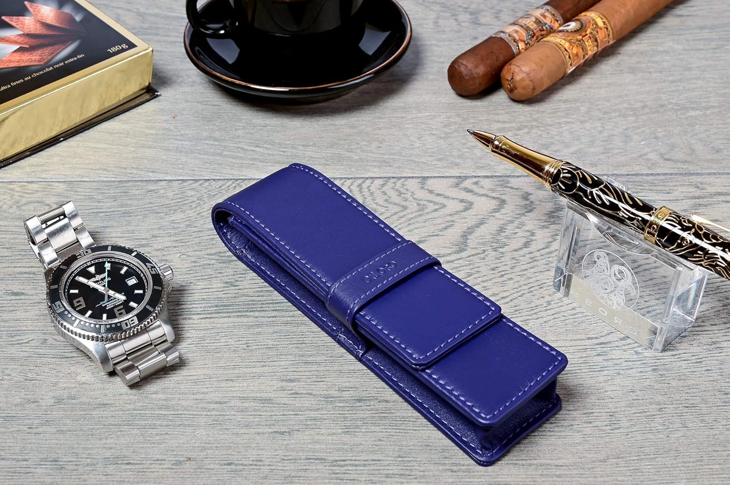 • Double Pen Holder made out of Full Grain Leather - Securely holds two (2) standard sized fountain pens, ballpoint, rollerball or mechanical pencils.